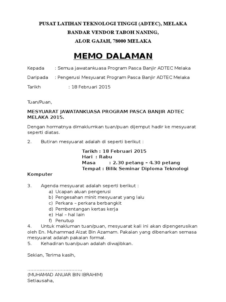 Contoh surat panggilan mesyuarat syarikat contoh surat terbaru. Text of memo panggilan mesyuarat.